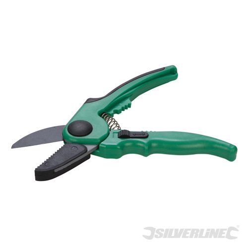 Poignées bi-matière. Lames en acier trempé à revêtement de téflon. Cran de verrouillage. Ecrase-branches entre les poignées.